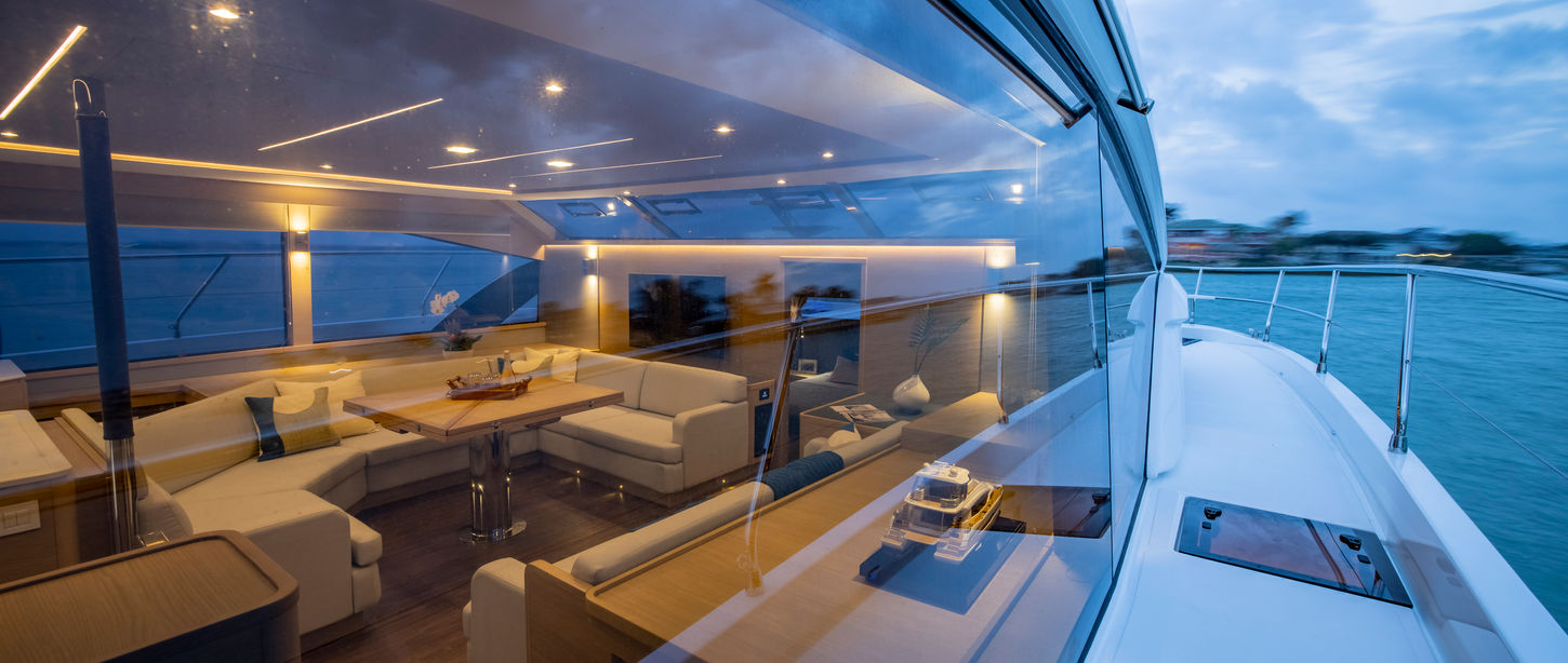 Eigner genießen atemberaubende Ausblicke aus der Hauptkabine, die durch große Panoramafenster geprägt ist.